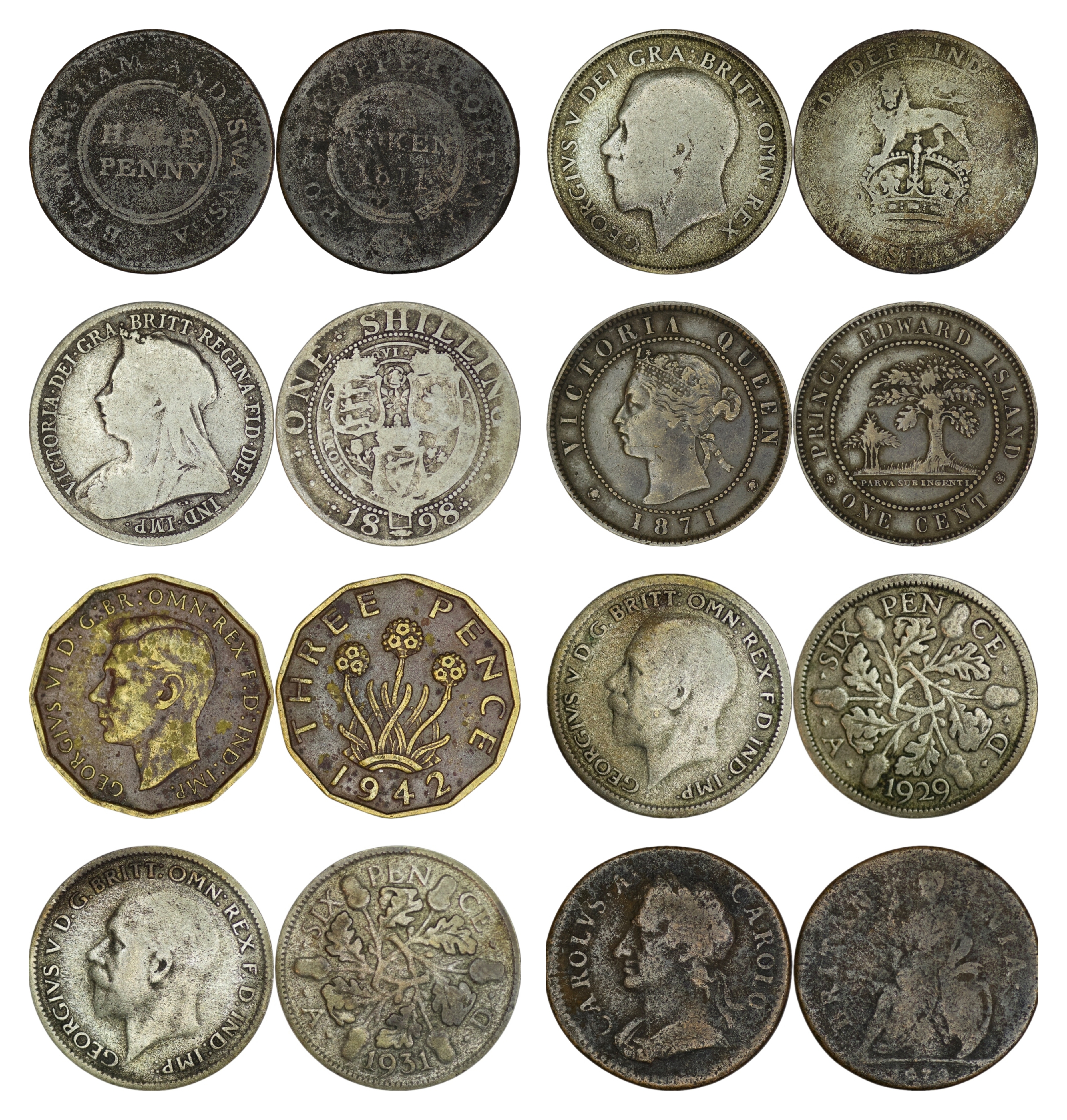 Great Britain. Lot of 8 Coins. Including Half Penny Token 1811. 1 Shilling 1922, 1 Shilling 1898, Prince Edward Island 1 Cent 1871, 3 Pence 1942, 6 Pence 1929 & 1931 and 1 Farthing Charles II 1679?. Fine to Very fine, including silvers.