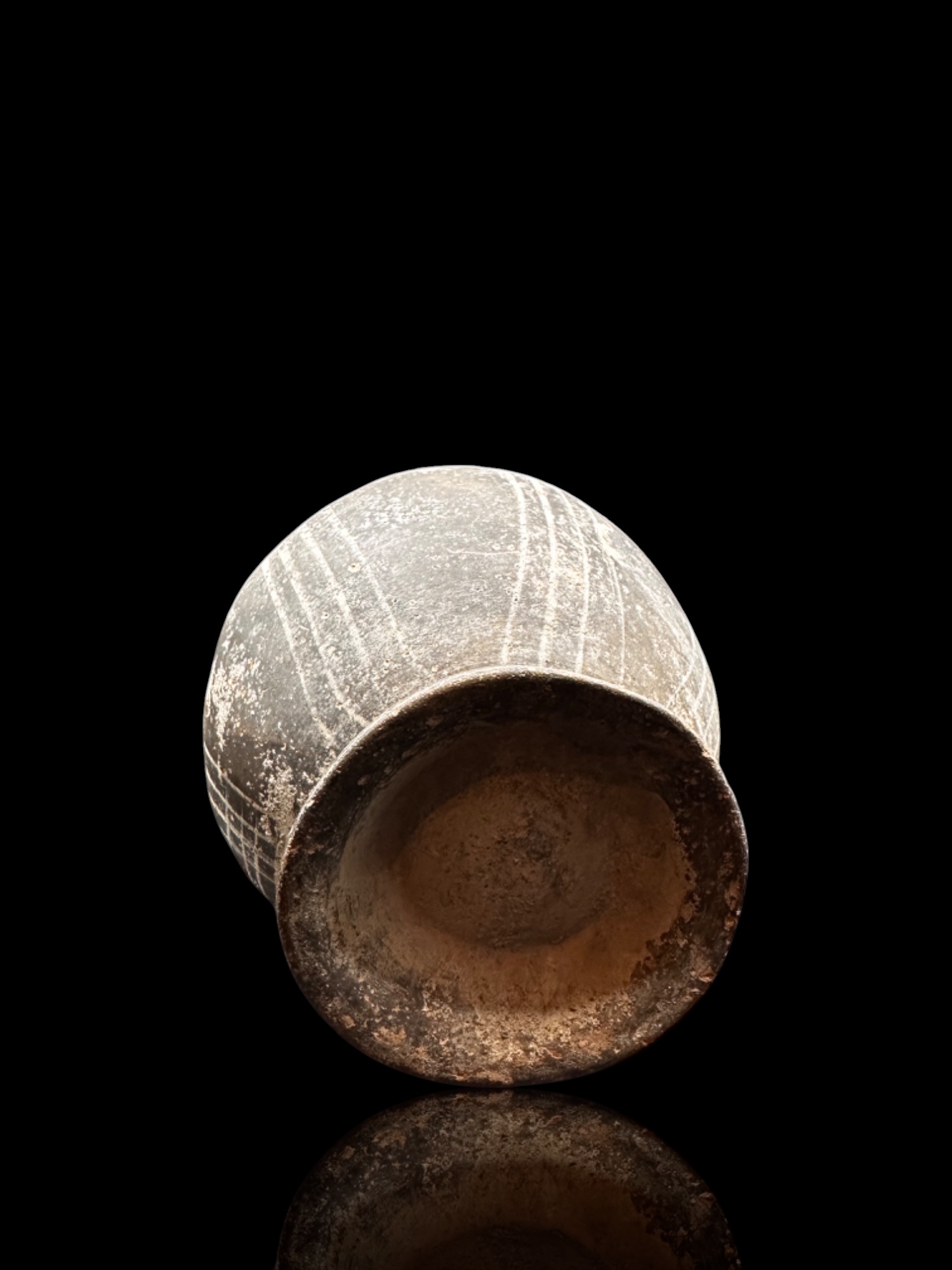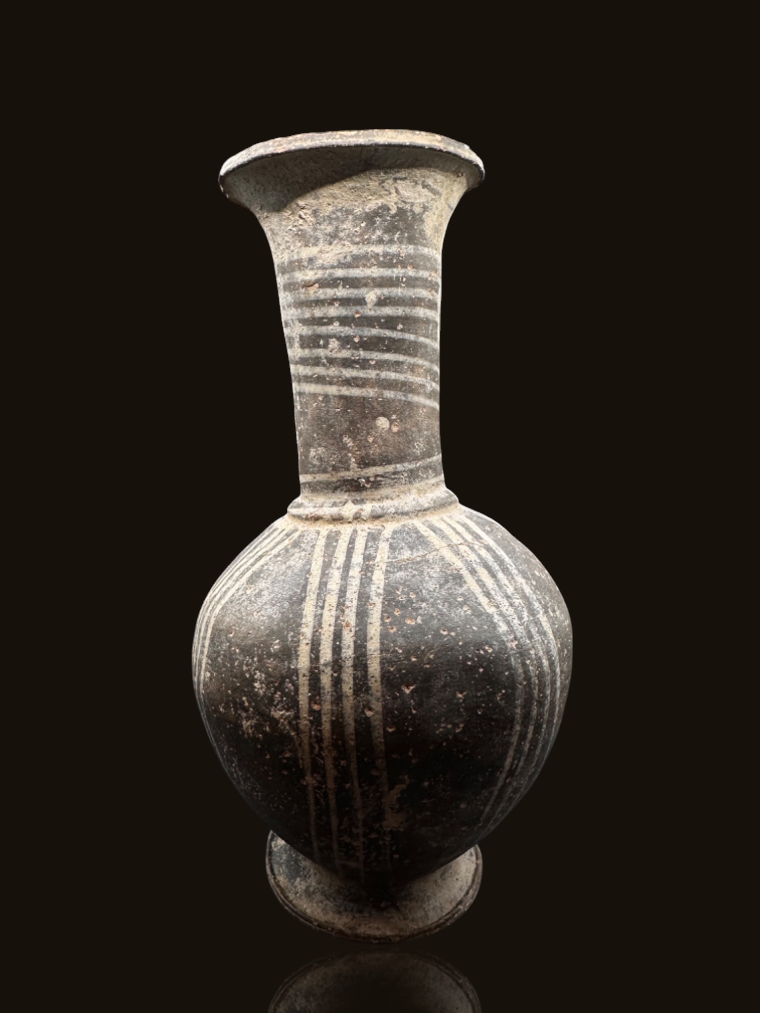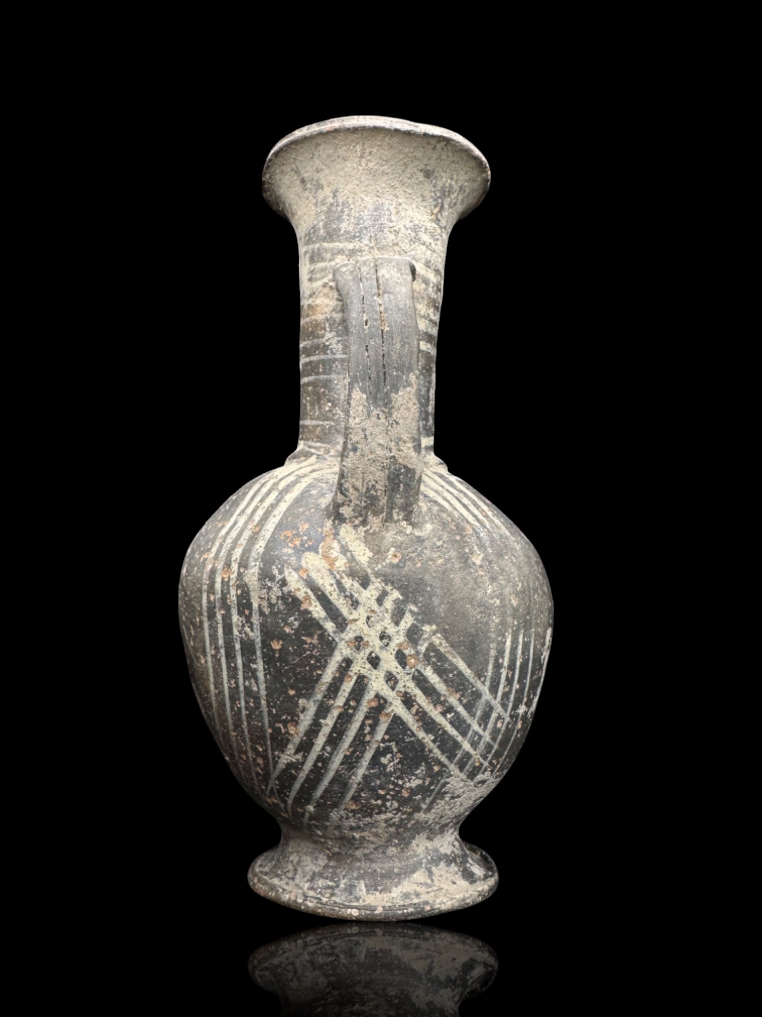 A slender Cypriot oinochoe from the bronze age, featuring a black slip surface with vertical and crisscross linear decorations in contrasting white. The vessel has a trefoil mouth, single handle, and ring base. Well-preserved with surface encrustations and minor wear consistent with age. Height 26.cm.