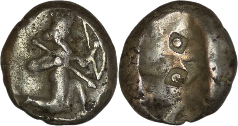Achaemenid Empire AR Siglos (4.77/ 13mm). Time of Xerxes II to Artaxerxes II. ( circa 420-375 BC). Persian king kneeling right, holding spear and bow; quiver over shoulder / Incuse punch. Carradice type IIIb C. Very fine.