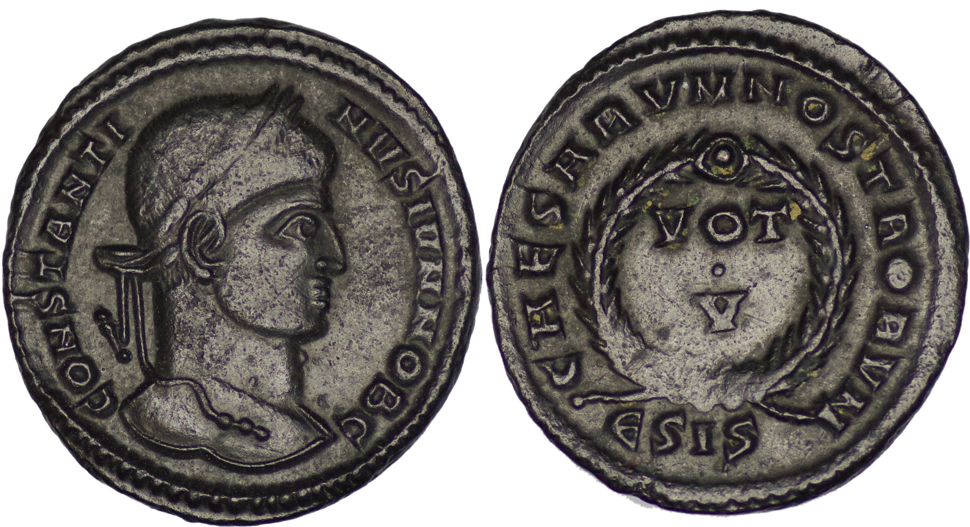 Roman Empire. Constantine II. As Caesar (AD 316-337). Æ Follis (2.77g/ 19mm). Siscia mint. 4th officina. Struck AD 320-321. Laureate head right / VOT/ V in two lines within wreath; ЄSIS. Extremely fine.