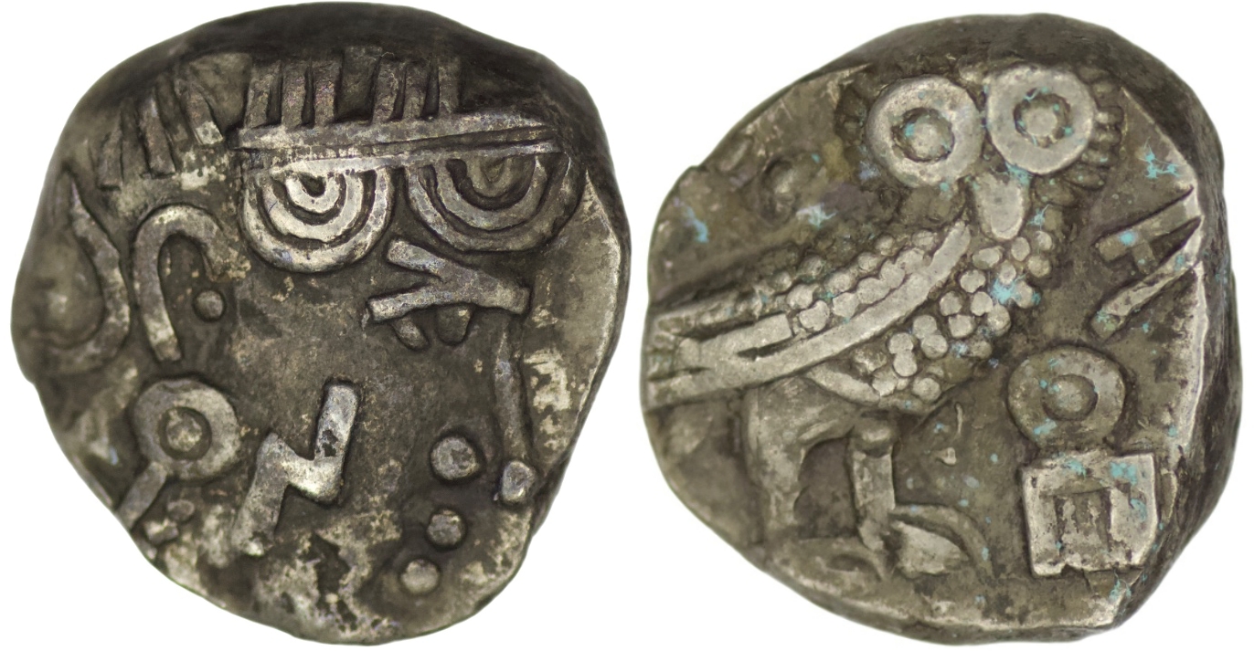 Arabia. Sabaean. Anonymous (ca. 3rd-2nd century BC). AR Unit (5.11g/ 15mm). Imitating Athenian issue, stylised helmeted head of Athena right, mark of value on cheek / Owl standing right with head facing, olive spray and crescent to left, AΘE to right. Huth-225, CAF-1.4i8. Very fine