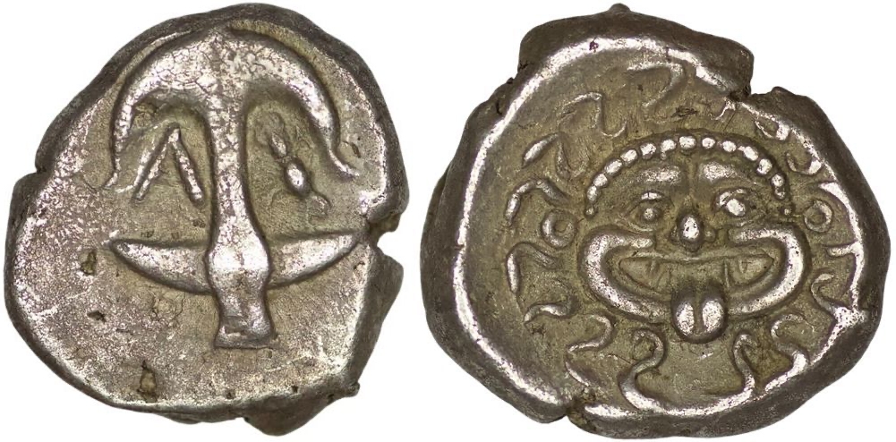 Thrace. Apollonia Pontika. Circa 480/78-450 BC. AR Drachm (3.35g/ 13mm). Light Thraco-Macedonian standard. Anchor; A and crawfish flanking / Facing gorgoneion within incuse circle. Topalov, Apollonia 42; HGC 3, 1323. About extremely fine. Ex Teutoburger Auction.
