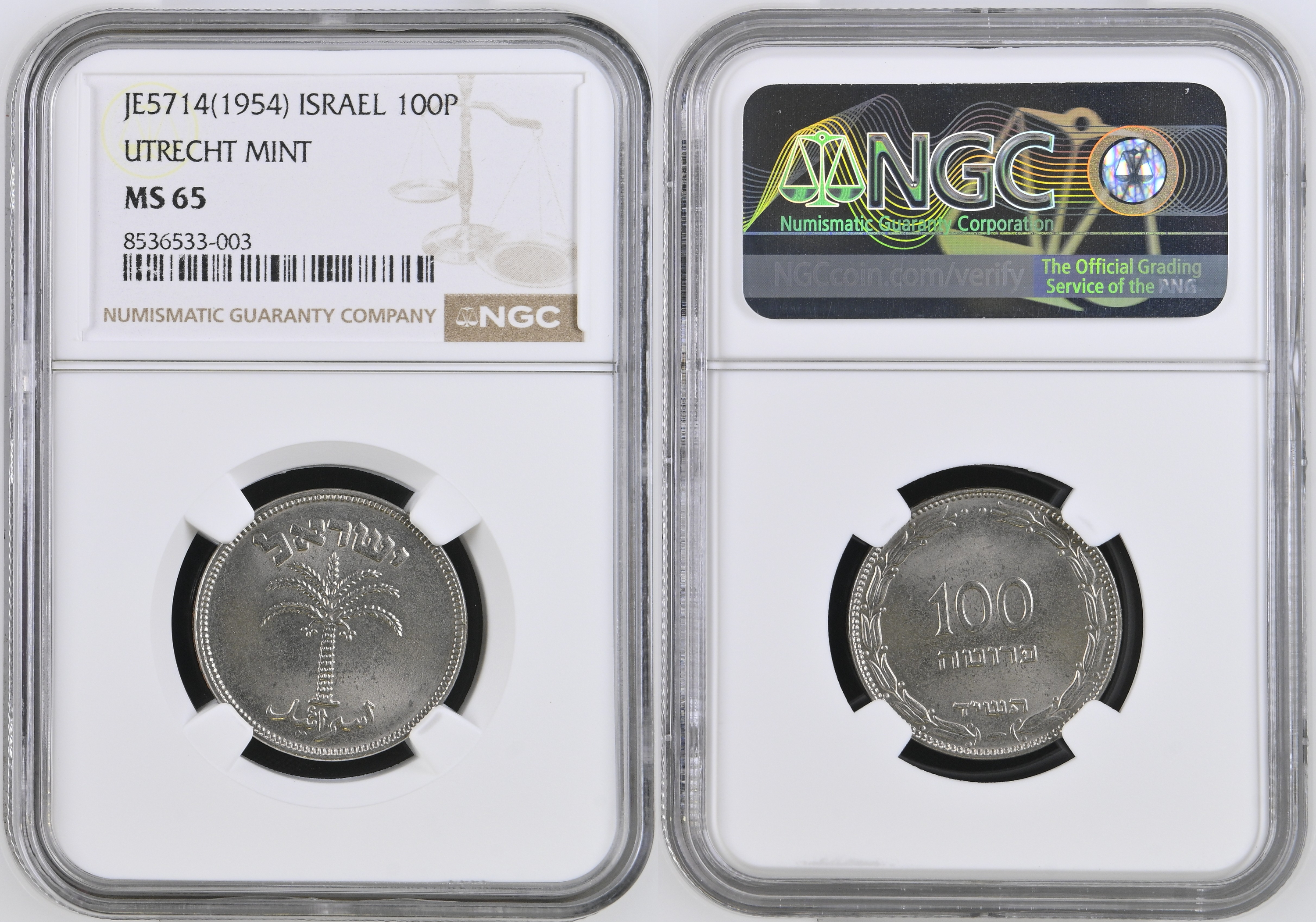 Israel. 100 Pruta. JE5714 (1954). Utrecht mint. NGC MS 65, Top Pop