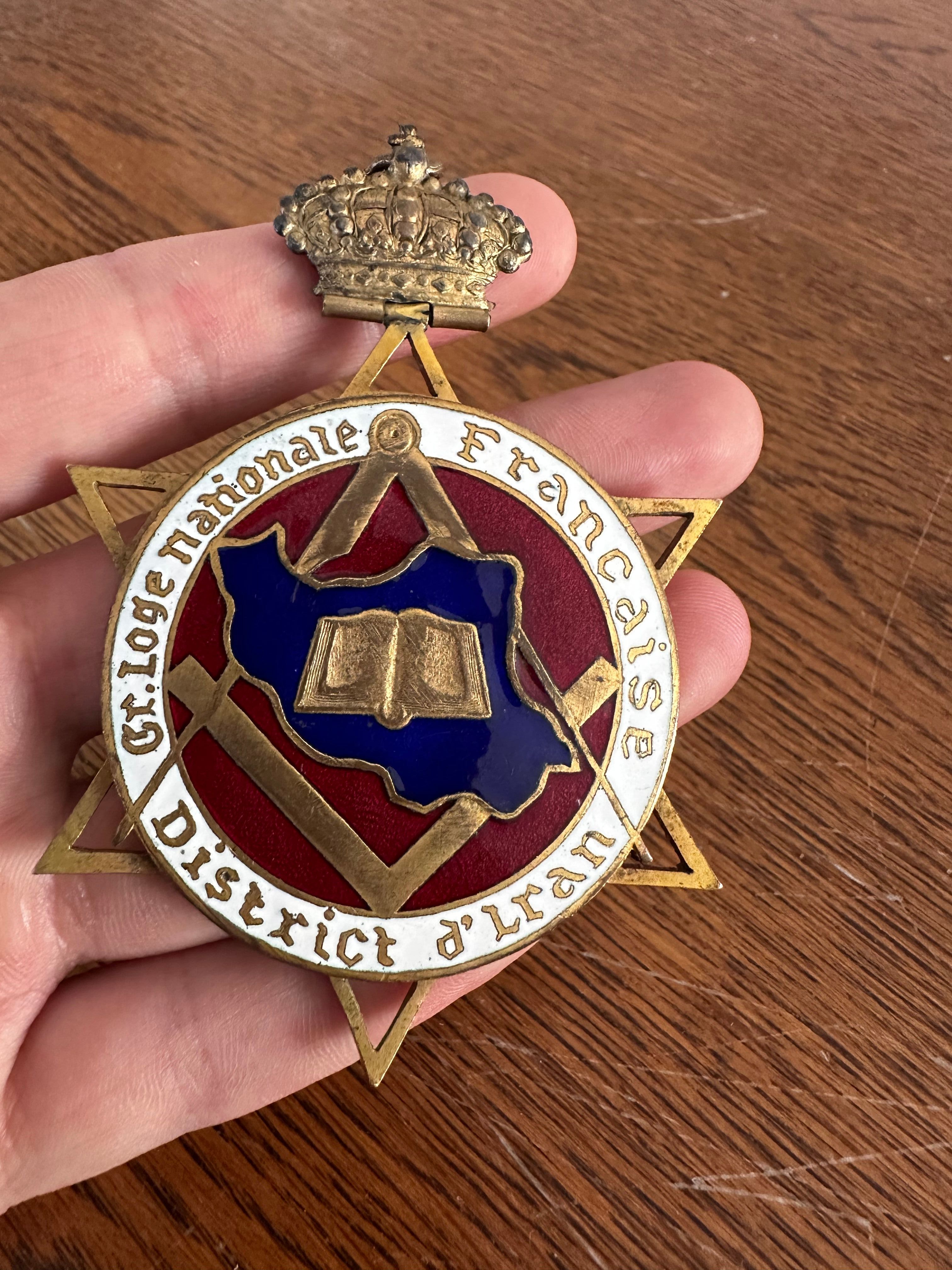 A rare and historically significant Masonic medal from the Grande Loge Nationale Française (French National Grand Lodge), issued for the District of Iran. The piece is crafted in gilt metal and enamel, designed as a six-pointed star surmounted by a crown. The central medallion bears the square and compass with an open book on a red and purple enamel ground. The surrounding white enamel ring is inscribed: “Gr. Loge Nationale Française – District d’Iran.” Reverse plain. An uncommon memento of French Freemasonry’s presence in Iran prior to the 1979 Revolution.