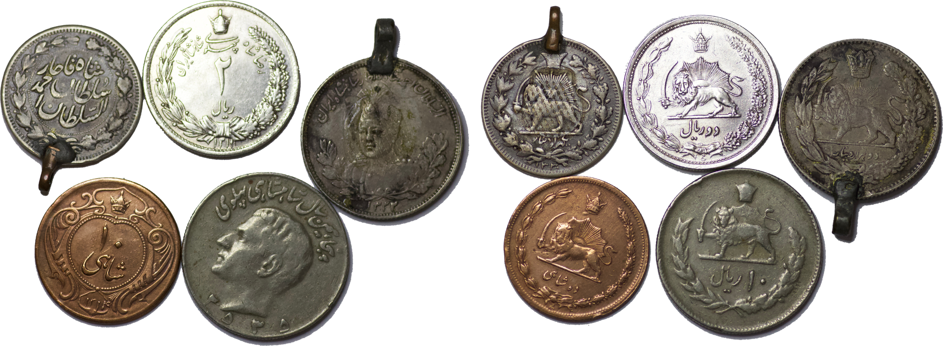Qajar. Pahlavi. Lot of 5 Coins. Including Qajar 1000 Dinars 1330, glued on obverse and reverse; 2000 Dinars; 2 Riyal 1311; 10 Shahi 1314 and 10 Riyal 2535. Fine condition.