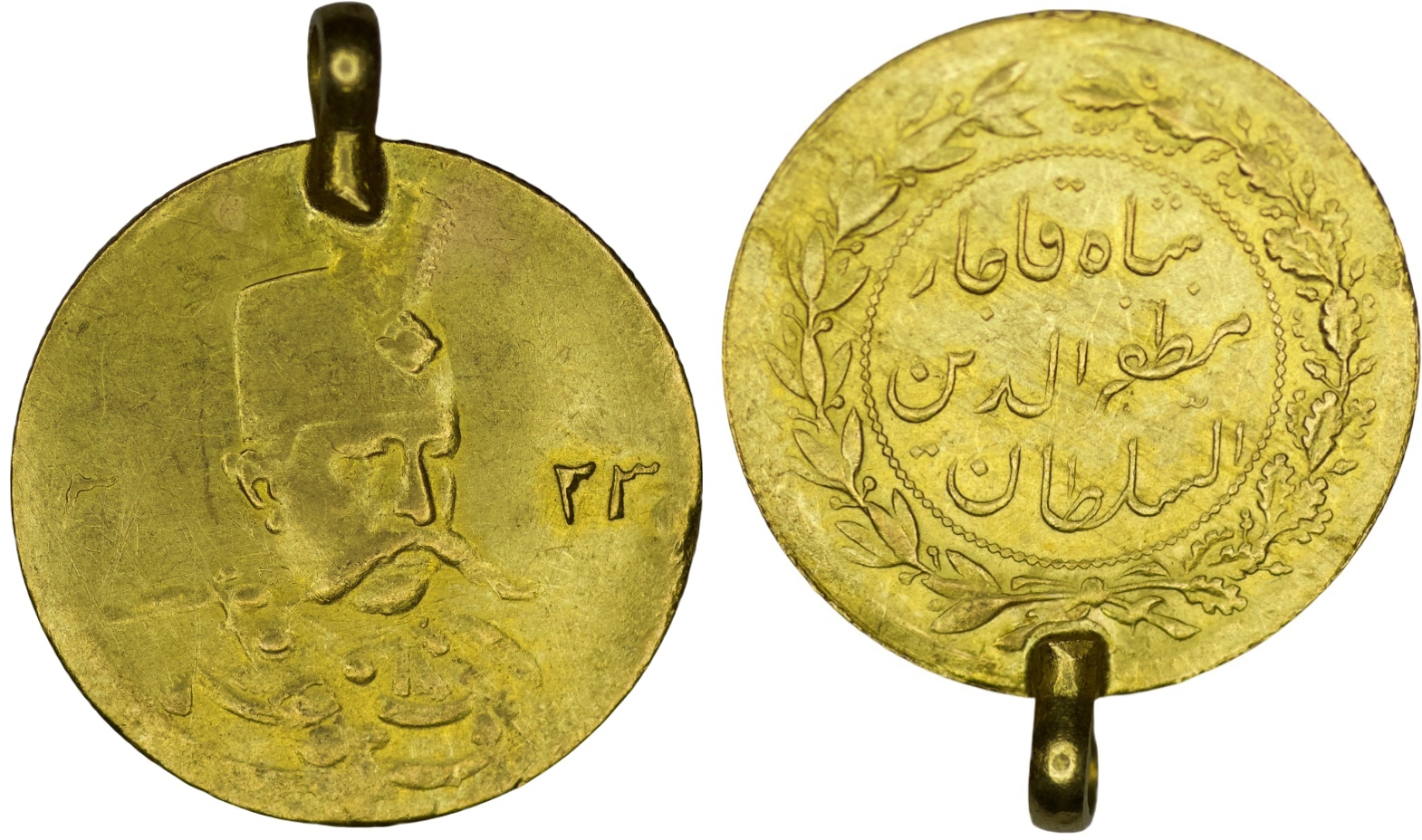 4.5% BP- Qajar. Mozaffar ad-Din Shah. 5000 Dinars. AH 1323. Pendant attached. KM 994.2.