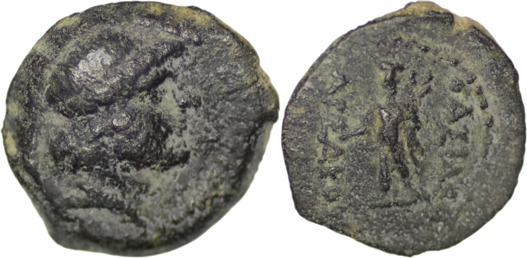 Parthian Empire. Phraates II (138-127 BC). Æ Chalkous (2.34g/ 14mm). Susa. Diademed head to right / BAΣIΛEΩΣ APΣAKOY, Hermes standing to left. Sunrise -; Sellwood 14.5. Very Fine. Extremely Rare.