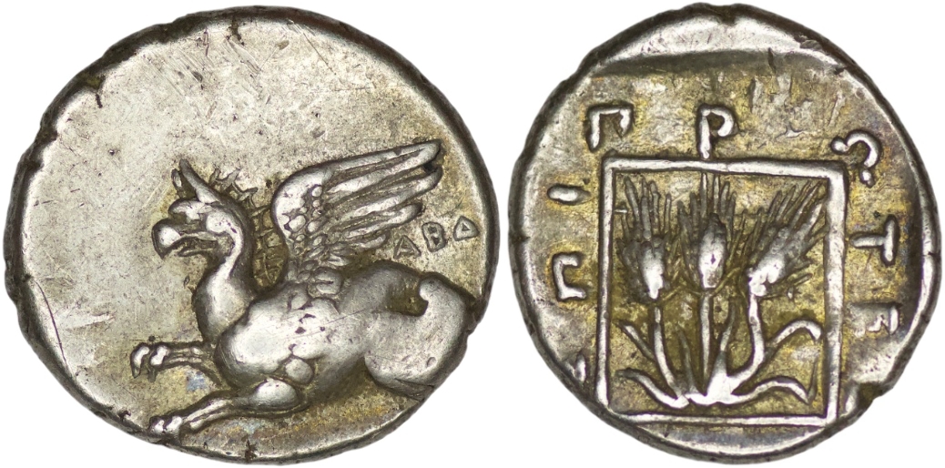 Thrace. Abdera. Circa 395-360 BC. AR Tetrobol (2.82g/ 15mm). Protes, magistrate. Griffin springing left / Three grain-ears within linear square; EΠI ΠPΩ-TEΩ around; all in incuse square. AMNG II 124; SNG Copenhagen 340. Extremely fine. Ex Teutoburger Auction.
