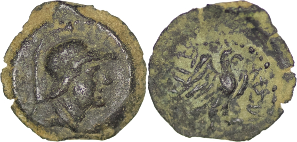 Elymais. Tigraeus (Tigraios) Usurper (138/7-133/2 BC). Æ (1.46g/ 13mm). Susa. Helmeted head right/ Eagle standing right, head right, wings open, BAΣIΛE (king) downward on right, TIΓPAIOY downward on left. Very fine. Extremely rare.