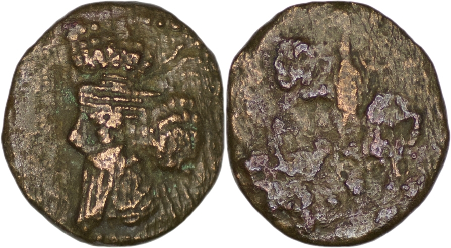 Elymais. Osroes (1st quarter of 2nd century AD). Æ Drachm (2.08g/ 16mm). Diademed bust left; hair in bunches above diadem and behind / Artemis standing right, drawing arrow from quiver and holding bow. Van’t Haaff Type 15.1.1; Alram 487. About very fine. Very rare.