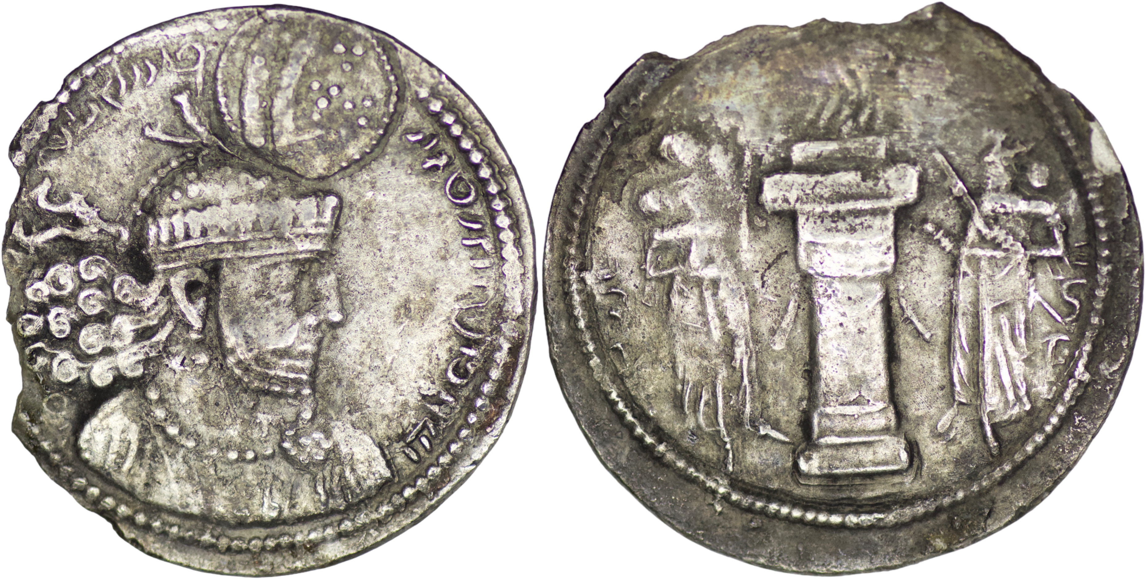 Sasanian Empire. Narseh (293-303 AD). AR Drachm (3g/ 25mm). Bust right wearing crown with arcades and korymbos. Reverse: Fire altar; flanked by two attendants, the left wearing crown, sword raised in left hand, fire altar with attendant wearing mural crown. Göbl type I/1; Sunrise 801 var. About very fine, edge damaged. Rare