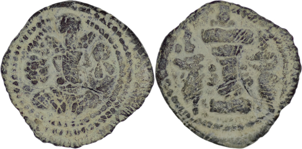 Sasanian Empire. Shapur II (309-379 AD). Lead Pashiz (1.75g/ 16mm). Draped bust of Shapur II to right, symbol to right/ Fire altar with ribbons, bust in flames, flanked by two attendants. Göbl type Ia/6a. Very fine. Rare.
