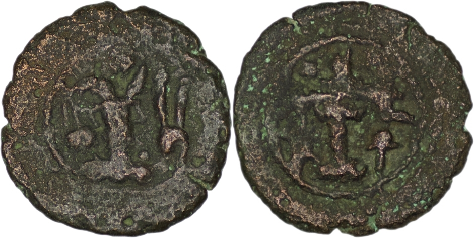 Sasanian Empire. Varhran IV (388-399 AD). Æ Pashiz (1.72g/ 15mm). Bust right, symble to right/ Fire altar. Very fine. Extremely rare.