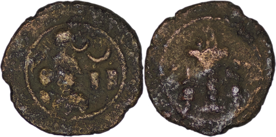 Sasanian Empire. Yazdgerd I (399-420 AD) Æ Pashiz (1.68g/ 16mm). Bust of Yazdgard I on floral ornament right, wearing mural crown with frontal crescent and korymbos/ Fire altar. Very fine. Rare.