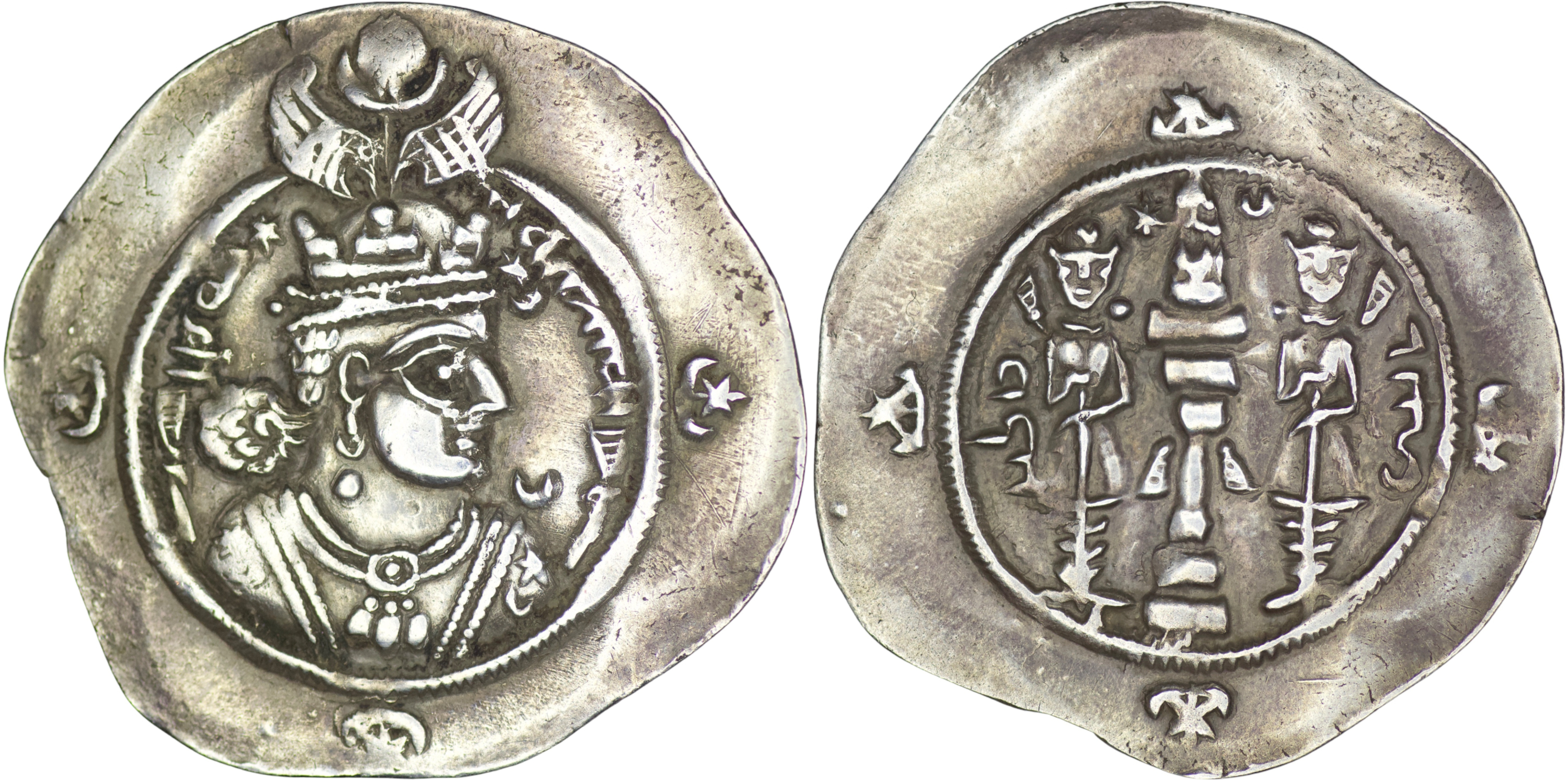 Sasanian Empire. Ardashir III (628-630). AR Drachm (4g/ 31mm). WYHC (Veh-az-Amid-Kavād). Year 2. Crowned bust right, crescent over left shoulder, ; star and star above crescent flanking crown / Fire altar with attendants and ribbon, star and crescent flanking flames, date to left, mint to right. Göbl II/1. Extremely fine.