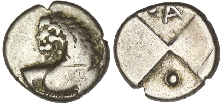 Thrace Chersonesos. (350-300 BC). AR Hemidrachm. (1.97g/ 12mm). Forepart of lion right, looking back, right foreleg raised/ Quadripartite incuse, two pellets in fields. Grose pl. 148, 2. Very fine.