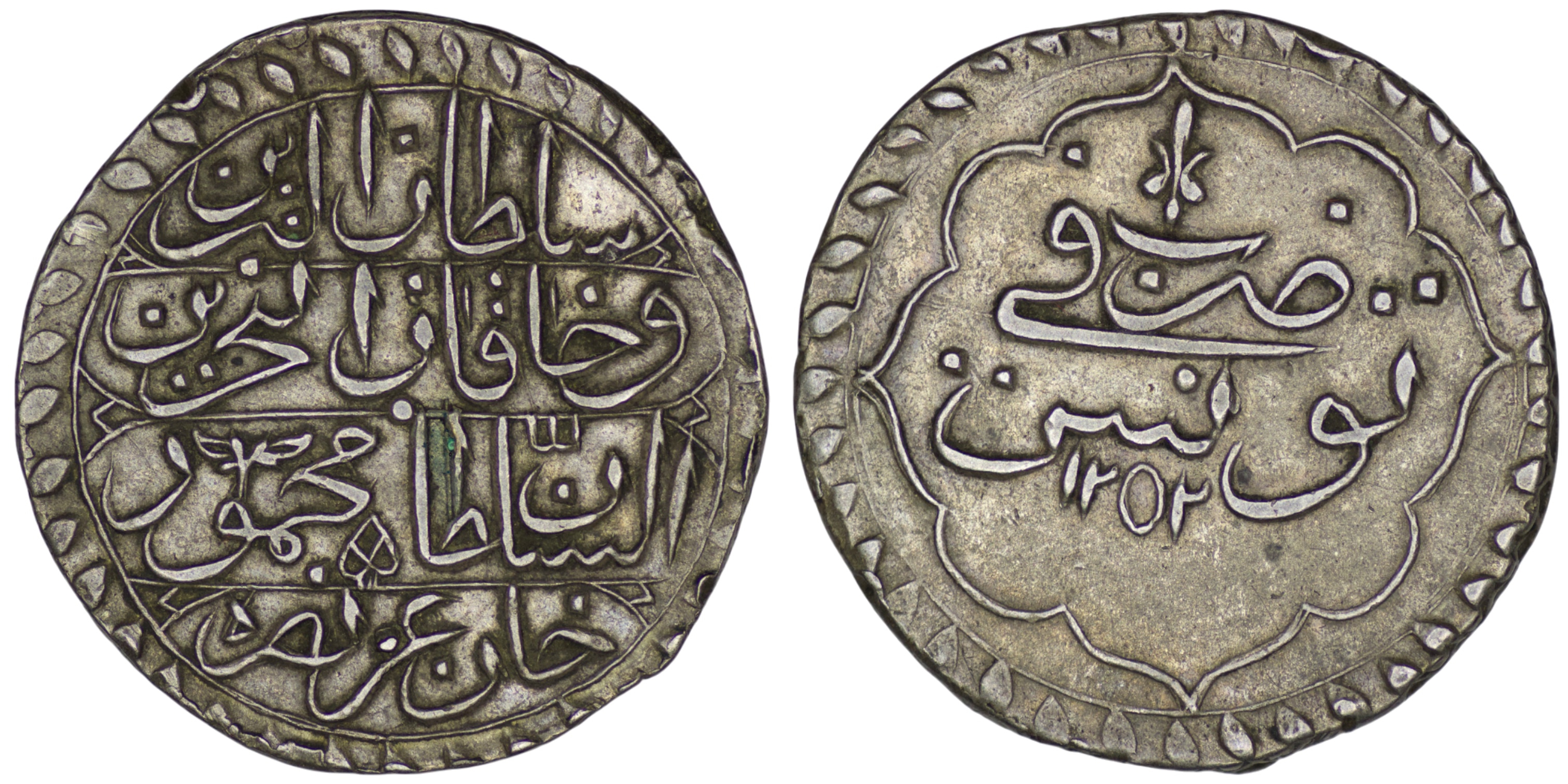 Ottoman Empire. Beylik of Tunis. Mahmud II (1808-1839). AR Rial. (11.42g/ 13mm). Tunisia. AH 1252. KM 90. Extremely fine.