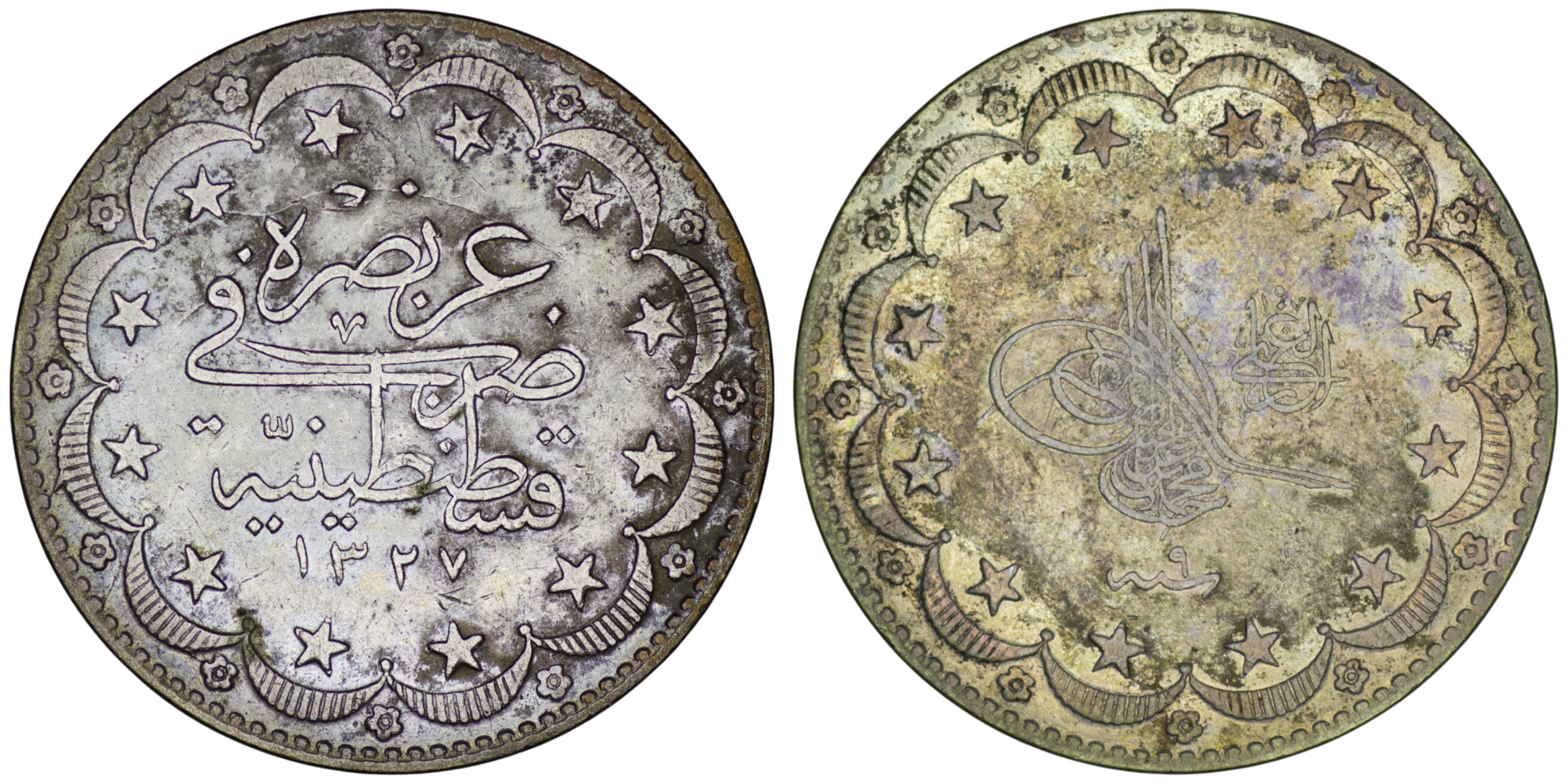 Ottoman Empire. Mehmed V (1909-1918). AR 20 Kurush. (23.90g/ 36mm). AH 1327// Year 9. KM 780. Very fine.