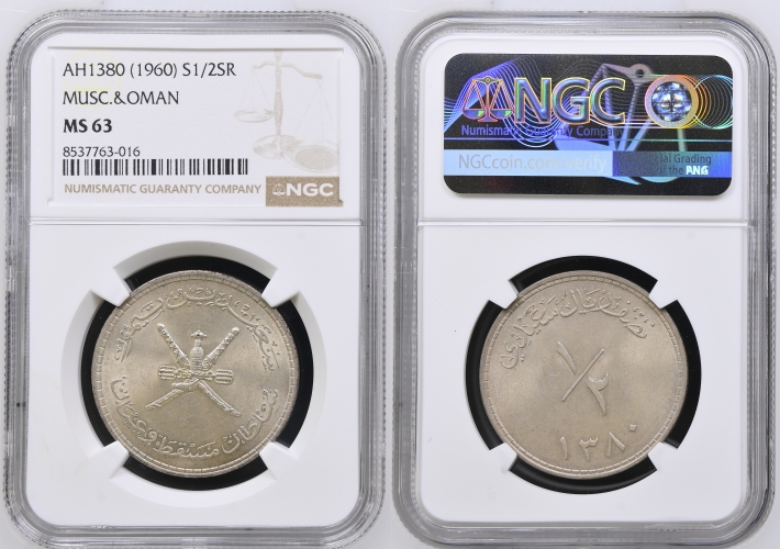 Muscat and Oman. Said bin Taimur (1932-1970). AR 1/2 Rial. (14g). AH 1380 (1960). KM 34. NGC MS63.