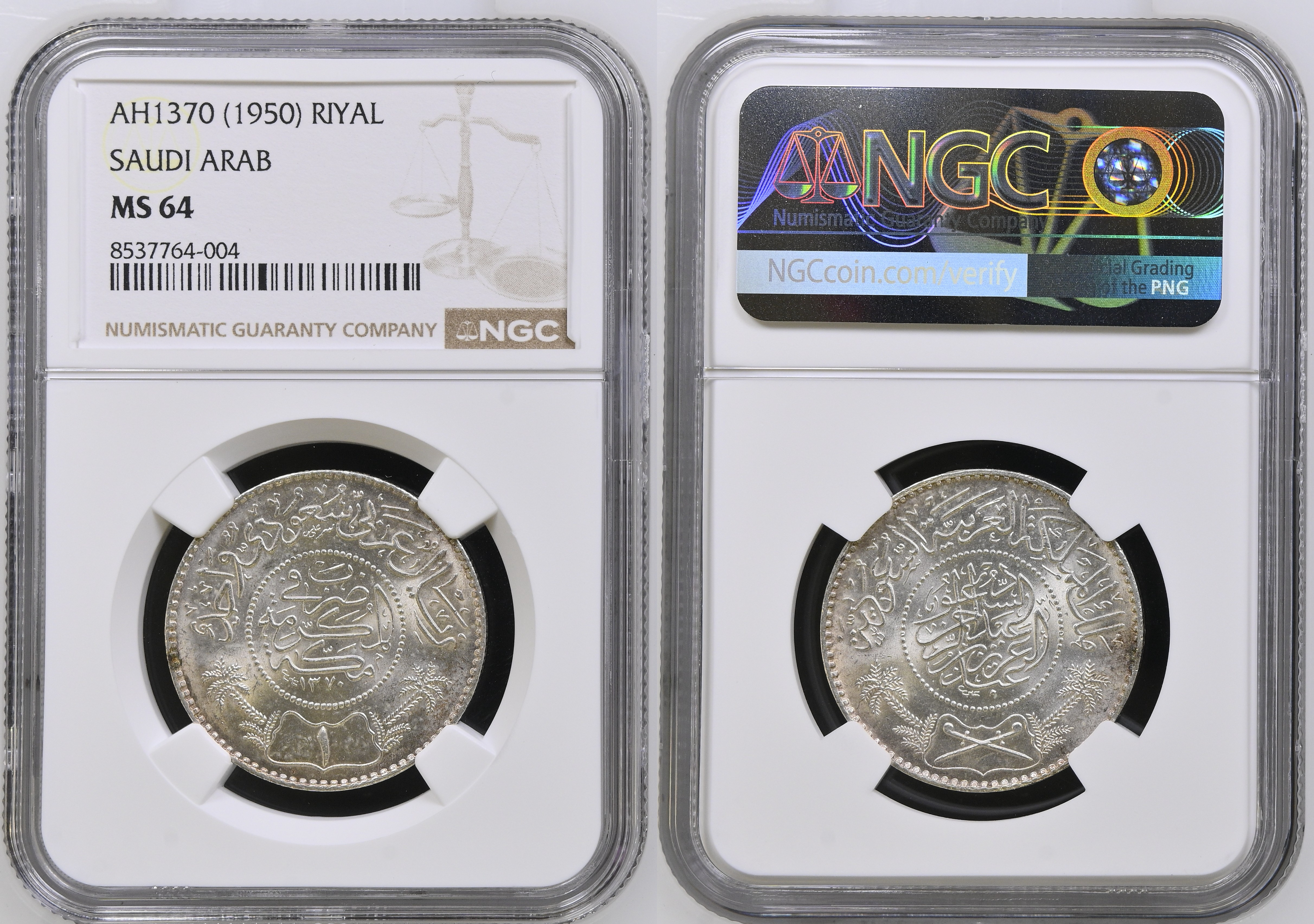 Saudi Arabia. Abdulaziz bin Abdulrahman (1921-1953). Silver Riyal. (11.6g). Mecca. AH 1370 (1950). KM 18. NGC MS64.