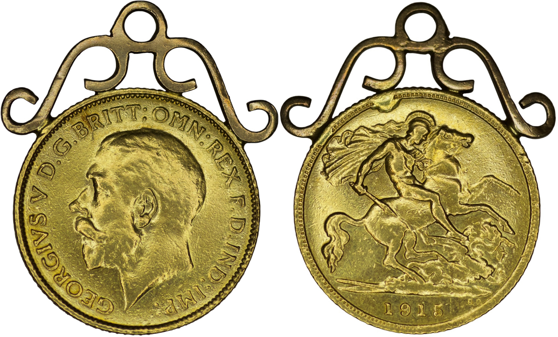 4.5% BP- United Kingdom. George V. 1/2 Sovereign. Mounted in a decorative pendant frame. 1915.