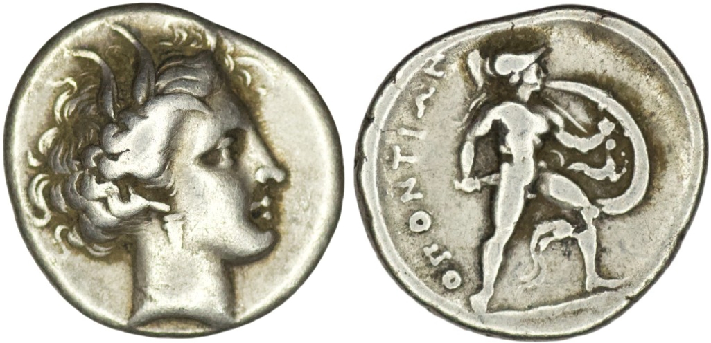Lokris. Lokri Opuntii. (340-330 BC). AR Triobol. (2.62g/ 16mm). Head of Persephone right, wearing wreath of grain ears, single-pendant earring and pearl necklace/ OΠONTIΩN; Ajax with helmet nude advancing right, holding sword in right hand; coiled serpent on shield, helmet crest between legs. BCD Lokris-Phokis 96. Fine.