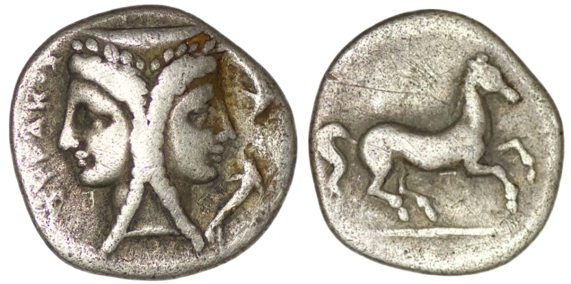 Sicily. Syracuse. (344-317 BC). AR Dilitron. (1.48g/ 13mm). Janiform female head; two dolphins to right/ Horse galloping right. SNG ANS 518. Fine.