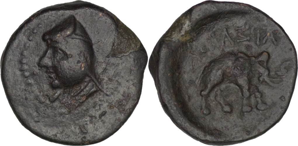 Parthian Empire. Phriapatios (185-170 BC). Æ Chalkous. (2.39g/ 14mm). Hekatompylos mint. Head left, wearing bashlyk/ Elephant advancing right; legend above. Sellwood 8.3. Extremely fine.