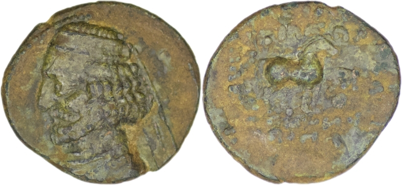 Parthian Empire. Phraates III (70-57 BC). Æ. (1.65g/ 15mm). Mithradatkart. Diademed bust of Phraates III left / ΒΑΣΙΛΕΩΣ ΜΕΓΑΛΟΥ ΑΡΣΑΚΟΥ ΕΥΕΡΓΕΤΟΥ ΕΠΙΦΑΝΟΥΣ , horse prancing right. Sellwood 38. Very fine.