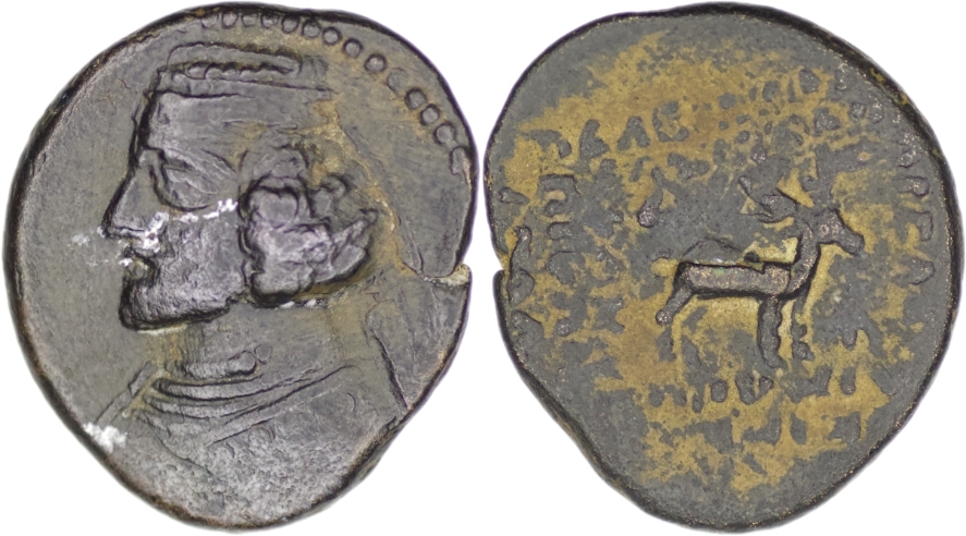 Parthian Empire. Orodes II (57-38 BC). Æ Tetrachalkon . (3.82g/ 18mm). Ekbatana. Diademed bust left/ Stag standing right; monogtams above and before. Sellwood 45.38. Very fine.