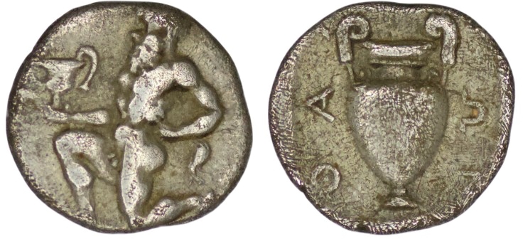 Islands of Thrace. Thasos. (411-350 BC). AR Trihemiobol. (0.85g/ 10mm). Satyr kneeling left, carrying kantharos/ Amphora. SNG Copenhagen 1029. Very fine.