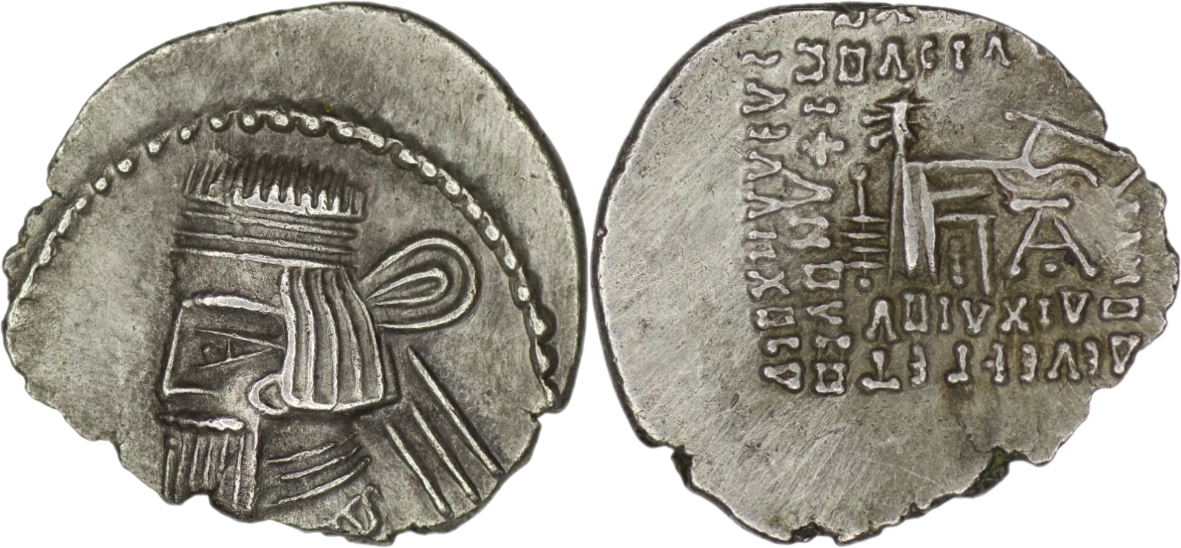 Parthian Empire. Artabanus II (AD 12-38). AR Drachm. (3.62g/ 21mm). Ecbatana. Bare-headed bust left with medium square cut beard, wearing diadem with loop at the top and three ends, hair almost straight, earring visible; border of dots/ Beardless archer, seated right on throne; in right hand, bow; below bow monogram 26; Greek inscription ΒΑΣΙΛΕΩΣ ΒΑΣΙΛΕΩΝ / ΑΡΣΑΚΟΥ / ΕΥΕΡΓΕΤΟΥ ΔΙΚΑΙΟΣ / ΕΠΙΦΑΝΟΥΣ ΦΙΛΕΛΛΗΝΟΣ, legend on left read from outside. Sellwood 63.6. Extremely fine.