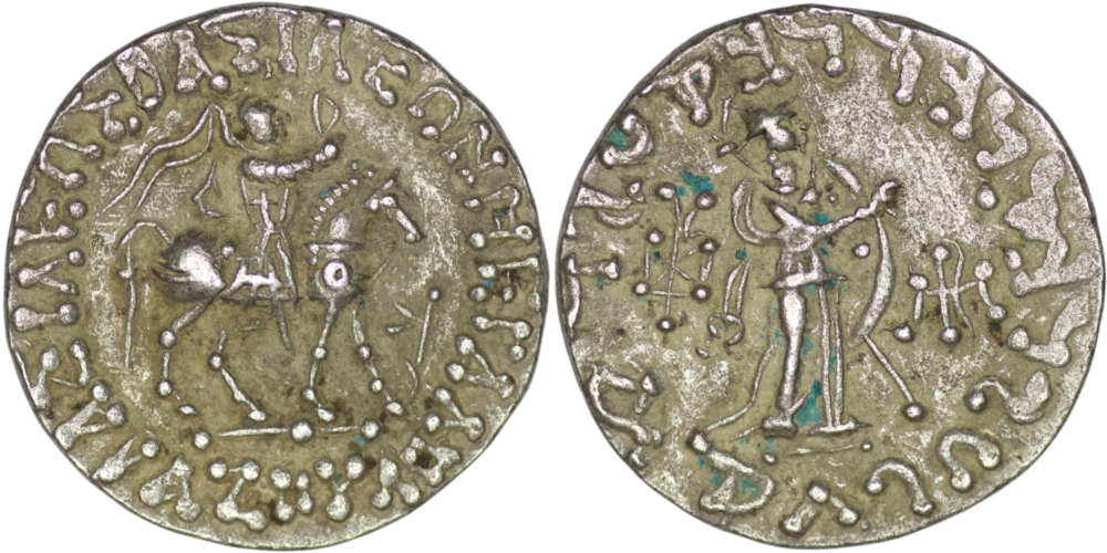 Indo-Scythians. Azes II (58-12 BC). AR Tetradrachm. (9.73g/ 24mm). BAΣIΛEΩΣ BAΣIΛEΩN MEΓAΛOY. Azes right on horseback, holding whip; gam in Karosthi to right/ Pallas Athene standing right holding spear and shield, right arm extended, monogram to left, Karosthi letter in right field. Hgc-12, 637. Extremely fine.