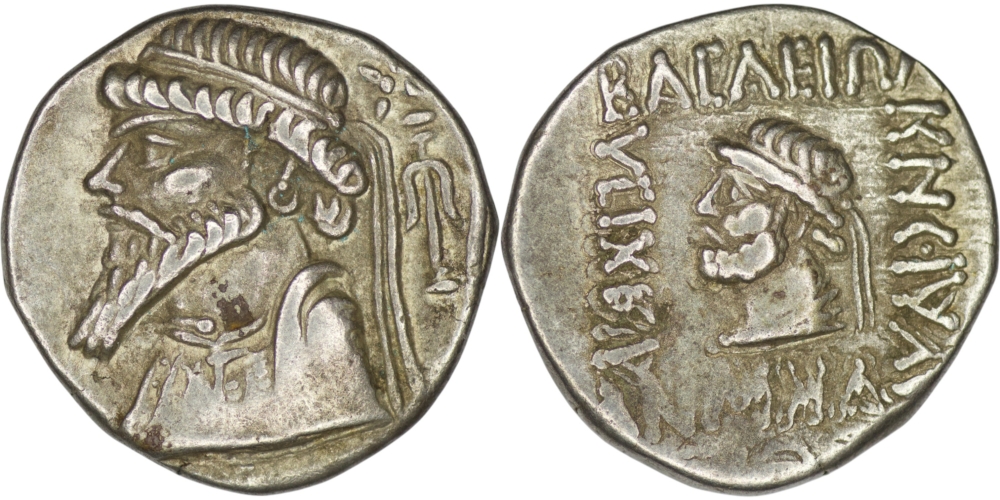 Elymais. Kamnaskires V (circa 54-30 BC). AR Tetradrachm. (15.23g/ 26mm). Diademed and draped bust of Kamnaskires left wearing torque, star above anchor in right field/ Diademed and draped bust left. van’t Haaf 9.1.1-3. Alram 463. Sunrise 479. Extremely fine.