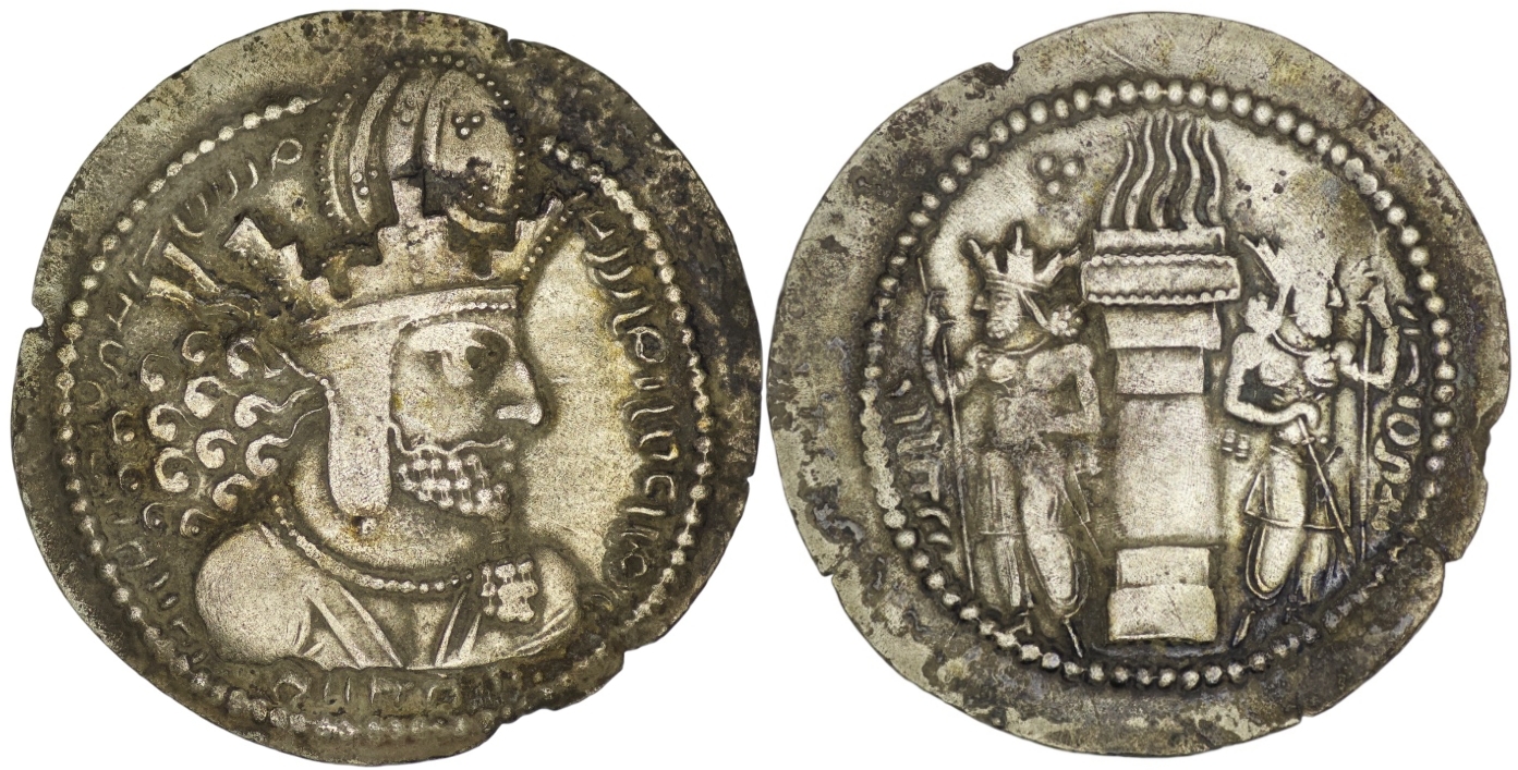 Sasanian Empire. Shapur I (240-270). AR Drachm. (3.78g/ 27mm). Bearded bust right wearing crown with earflaps, surmounted by globe decorated with concentric arcs, legend inside beaded border/ Zoroastrian fire altar, three dots above, attendant facing outward, each attendant with staff in one hand, between each attendant and rim. Very fine.