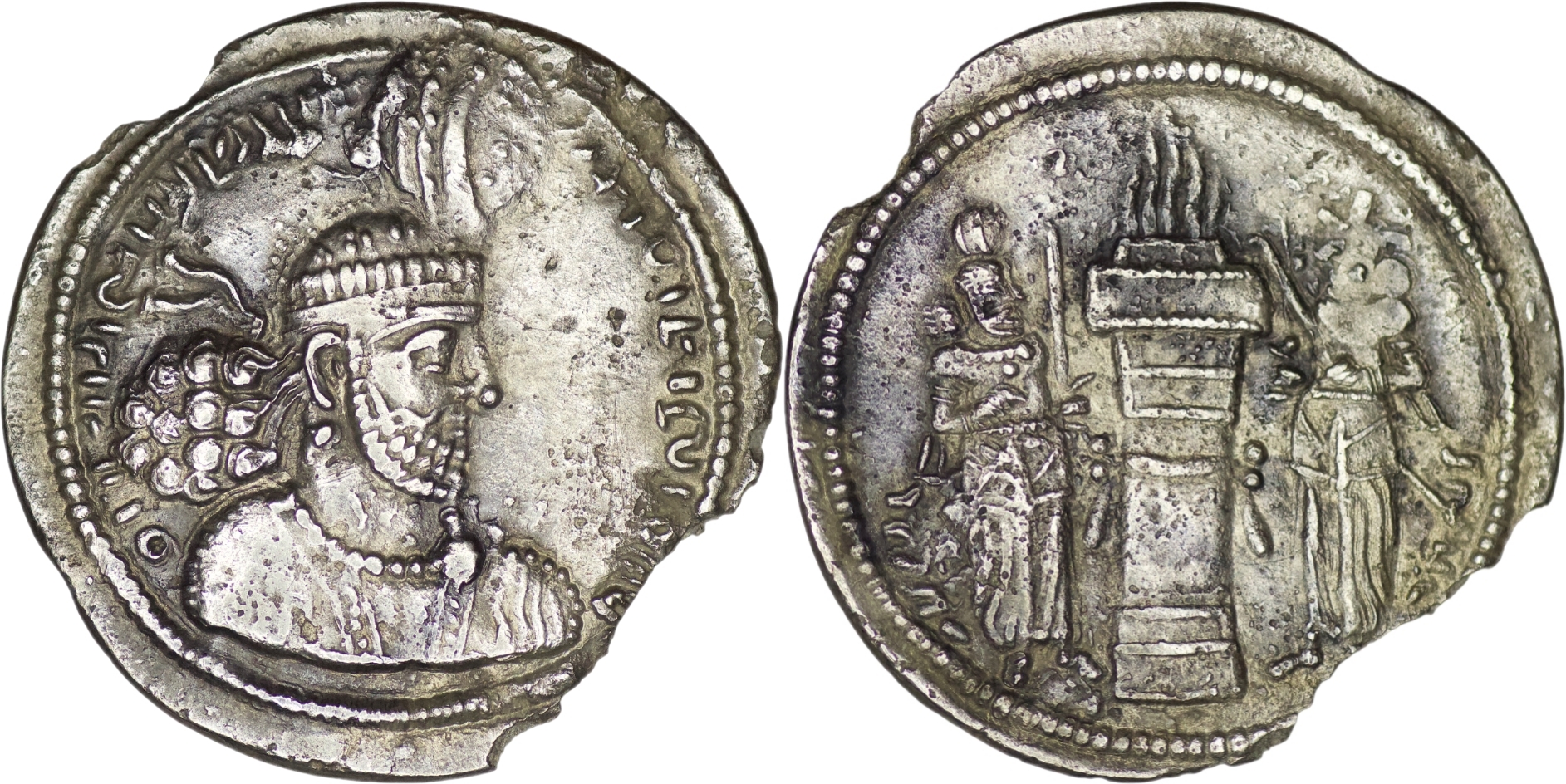 Sasanian Empire. Narseh (293-303 AD). AR Drachm (3.48g/ 25mm). Bust right wearing crown with arcades and korymbos. Reverse: Fire altar; flanked by two attendants, the left wearing crown, sword raised in left hand, fire altar with attendant wearing mural crown. Göbl type I/1; Sunrise 801 var. About very fine, edge damaged. Rare