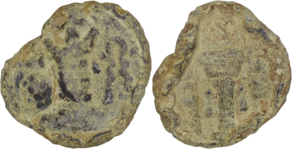Sasanian Empire. Shapur II (309-379 AD). Lead Pashiz (4.51g/ 16mm). Bust right, symbol to right/ Fire altar and two attendants. Fine. Rare.