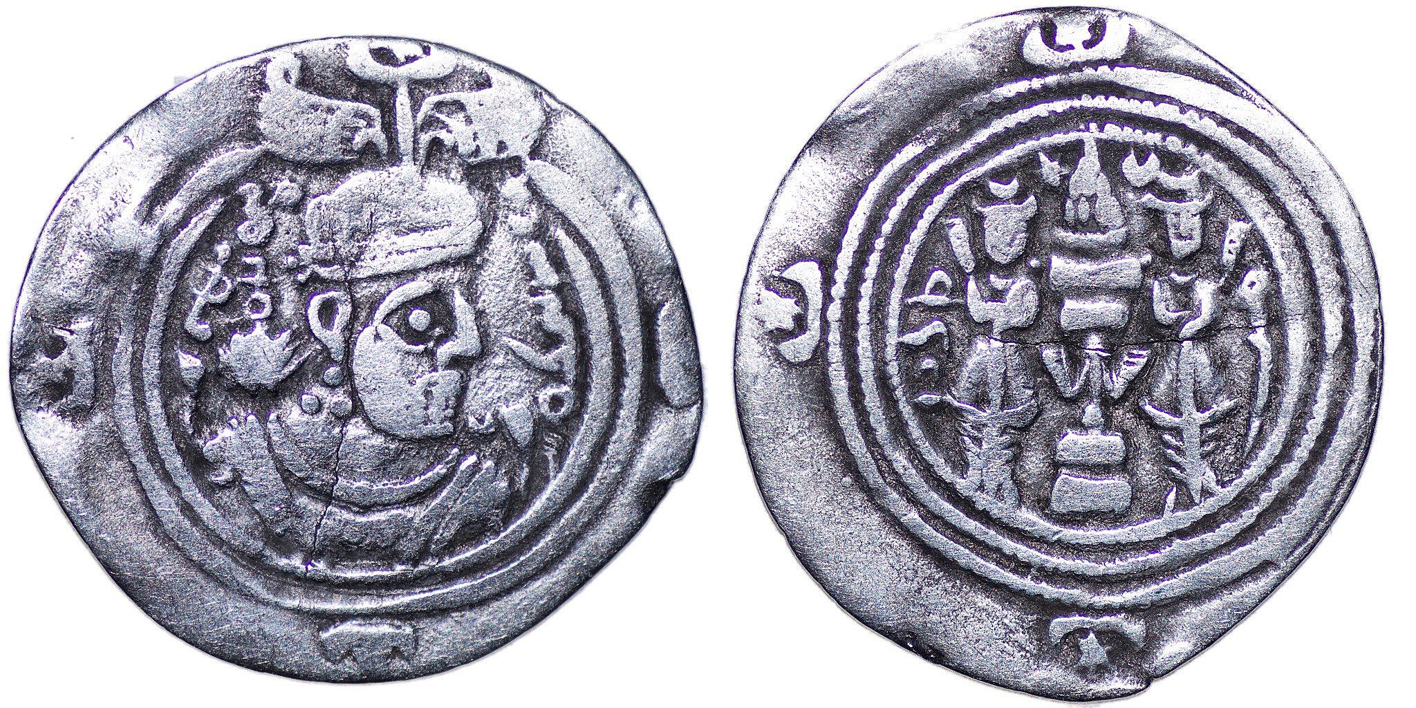 ), MY (Meshan) mint, Year 3. Draped bust of Hormizd V to right, wearing elaborate mural crown; behind head, AFZUT GDH (‘may his kingship increase’ in Pahlawi); before head, WHLMZD (‘Hormizd’ in Pahlawi)/ Fire altar with ribbons flanked by attendants; star and crescent flanking flames; all within triple border with star-in-crescents in margin. Göbl 231.