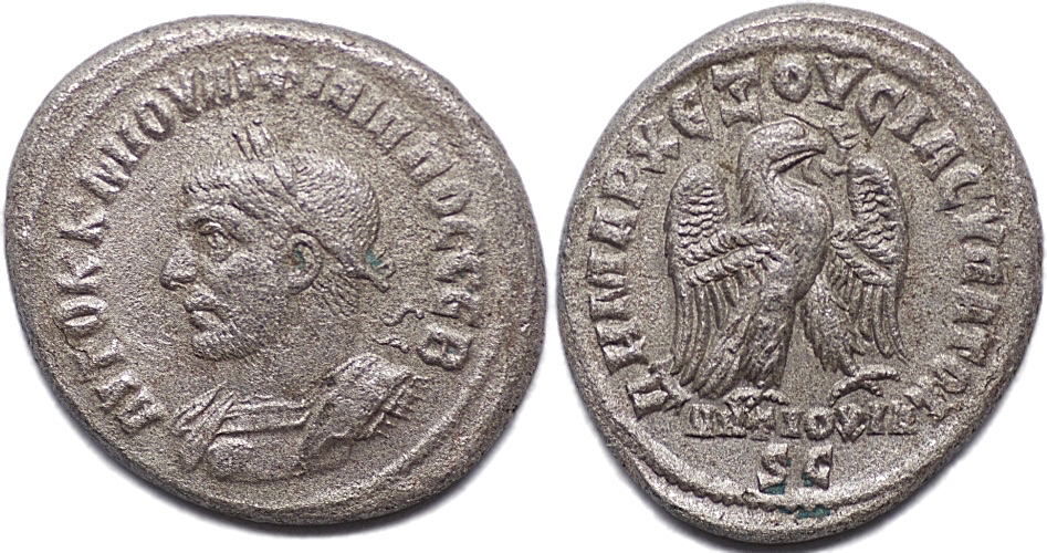 ΑYΤΟΚ Κ Μ ΙΟYΛ ΦΙΛΙΠΠΟY CЄB Laureate, draped bust of Philip I to left, seen from behind./ ΔHMAΡX ЄΞOVCIAC VΠA TO Δ Eagle with spread wings standing facing, head to right and holding wreath in beak.