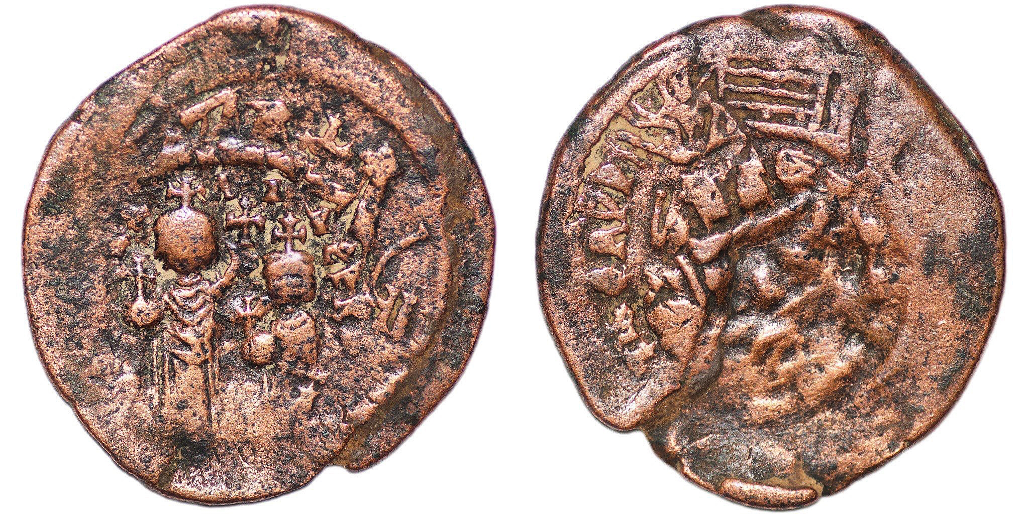 “BYZANTINE EMPIRE. Heraclius, (610-641 AD). AE Follis (10.61g, 35mm). Heraclius and son, Thessaloniki mint, overstruck on follis of Maurice Tiberius (possibly), F