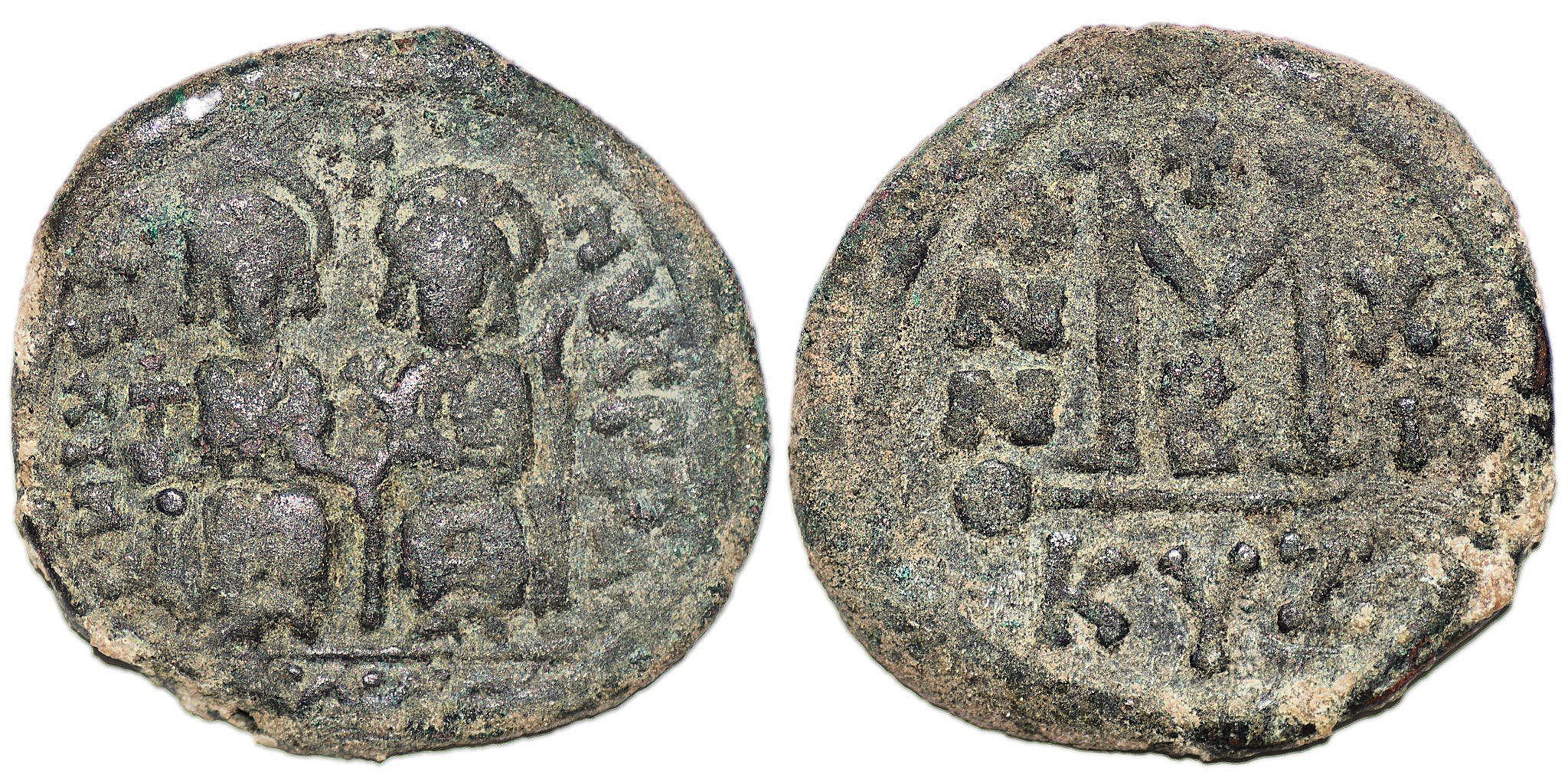 Byzantine Coins JUSTIN II (565-578). Follis(12.26g, 28mm). Kyzikos. Year 10. D N IVSTINVS P P A. Justin, holding globus cruciger, and Sophia, holding cruciform scepter, seated facing on double throne, both nimbate; cross between/Large M between A/N/N/O and B (date); cross above, B below, KYZ in exergue. Sear 372.