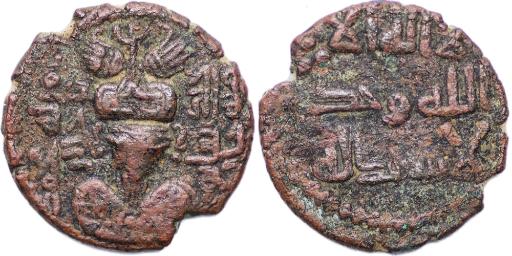 ARAB-SASANIAN: Muhammad b. Jabir, AH100 , AE pashiz (2.73g/ 18mm), Junday Sabur, ND/DM, A-U42, Gyselen—, facing Sasanian bust, wearing winged crown (as of Khusro II), Arabic amara bihi muhammad bin jabir left, mint name junday sabur right, Ma’a (100) to the right with probably another Arabic word or two also at the right // Wahdahu la sharika lahu.