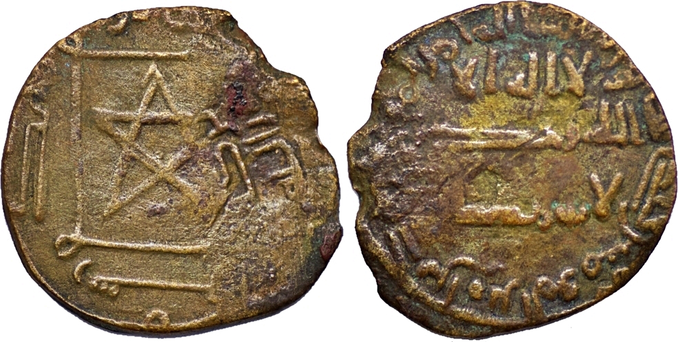 ABBASID: AE fals (2.73g/ 22mm), Junday Sabur, AH151, A-J327, Star and Islamic legends; countermark in Arabic “Barkat Allah” ( God’s blessing) on Obverse/ Islamic legends on reverse, VF. Rare.