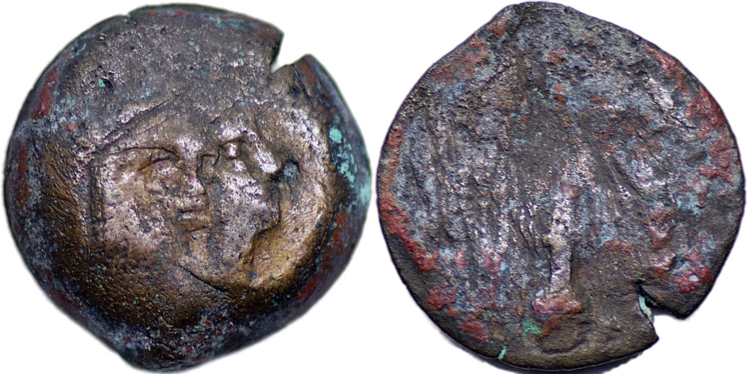 SELEUKID KINGS, Antiochos III. 222-187 BC. Æ (3.61 gm; 17 mm). Seleukeia on the Tigris. Jugate heads of Apollo and Artemis, Apollo facing slightly right, artemis facing right / Tripod with holmos. SC 1189; HGC 9, 543. Nice brown and earthen patina. Choice F.