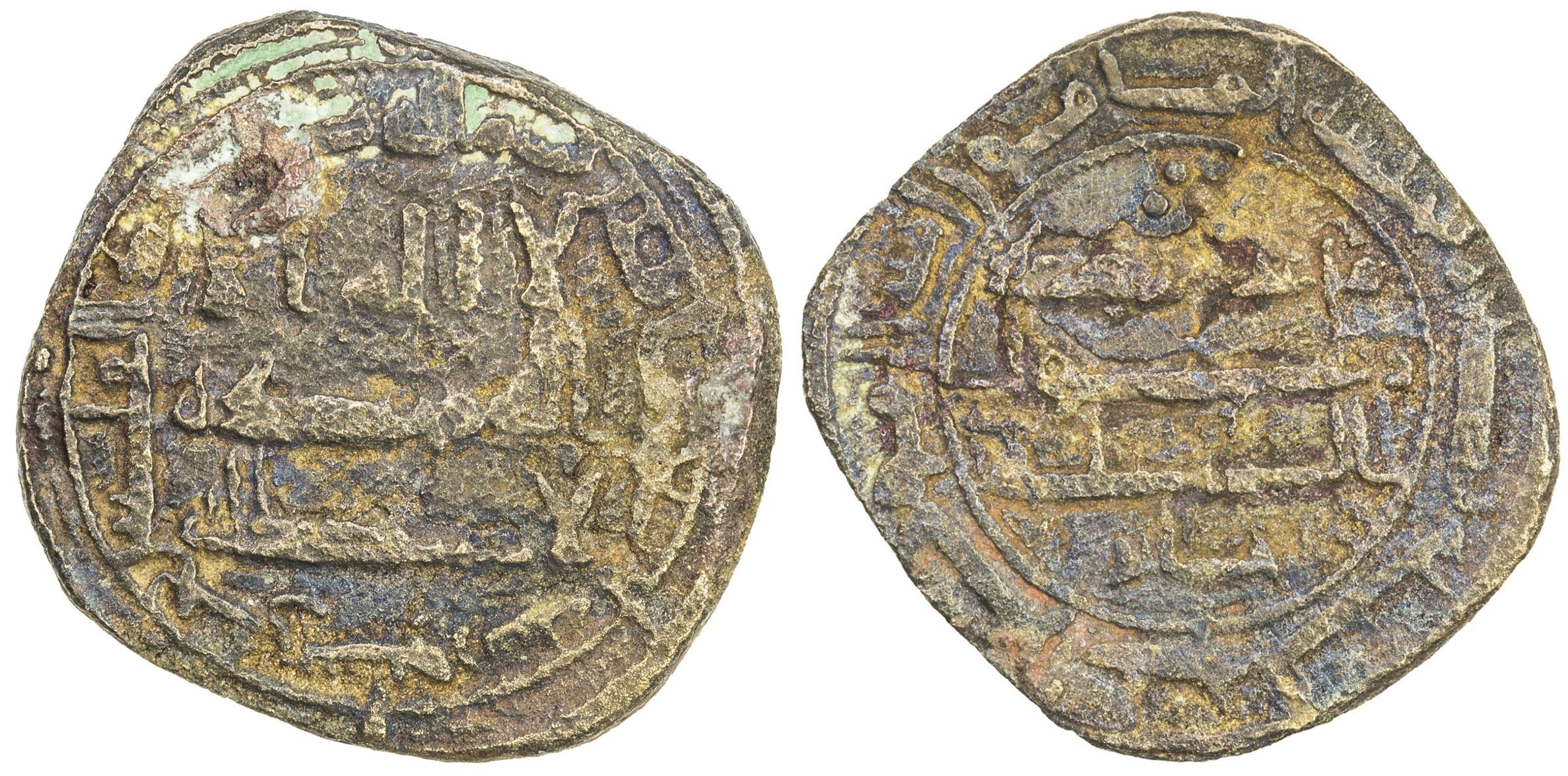 ABBASID: AE fals (3.11g), Junday Sabur, AH204, A-J327, citing the caliph al-Ma’mun, some porosity, clear mint & date, Fine to VF, RRR.