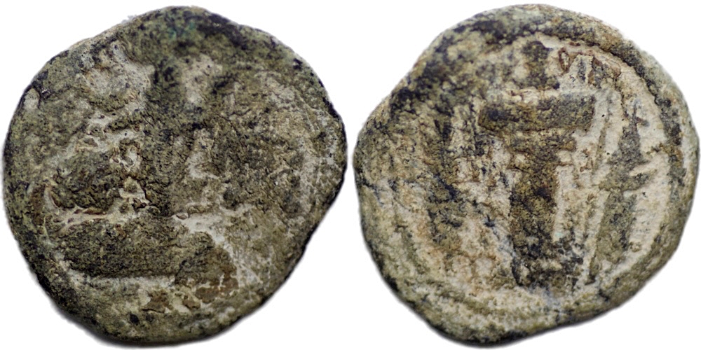 SASANIAN KINGS, Shahpur II, AD 309-379. Lead Pashiz (3.83 gm; 17 mm). No mint. Bust of Shapur II right, wearing mural crown with korymbos and inner ribbon / Fire altar with ribbon and bust right in flames, flanked by two attendants. Choice VF. Nice original find patina. Extremely rare.
