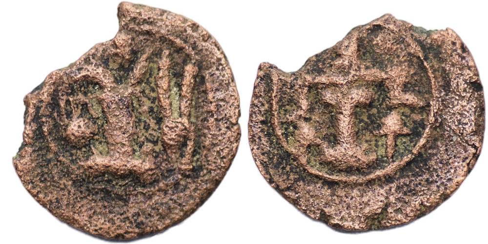 SASANIAN KINGS. Vahram (Bahram) IV. AD 388-399. AE Pashiz (1.28 g, 14 mm). Crowned bust of Vahram right, Symbol to the right/ Fire altar (Same as Ardashir I samples) VF. Extremely rare.