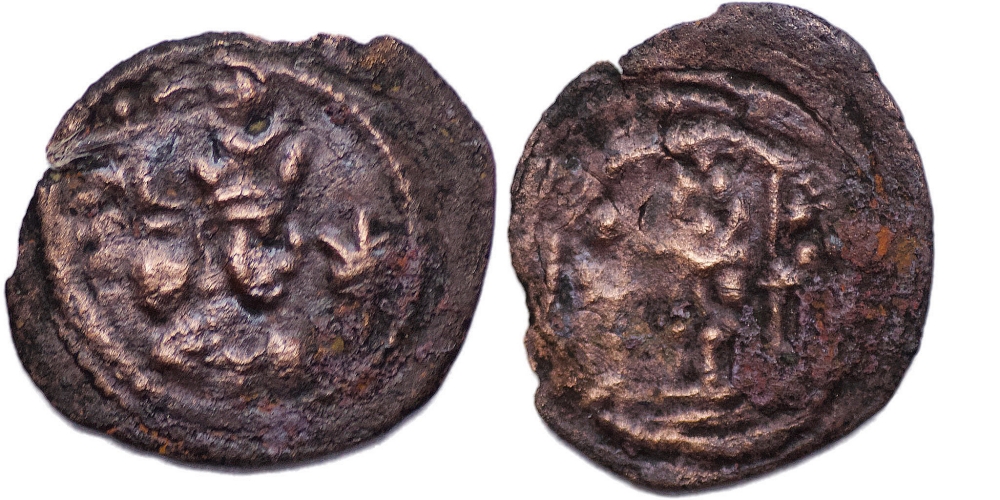 SASANIAN KINGS, Vahram V (Varahran). AD. 420-438. Æ Pashiz (0.94 gm; 15 mm). Vahram’s bust right, diadem and crescent to right / fire-altar & two attendants. Gobl I/1. Original green earthen patina. VF.