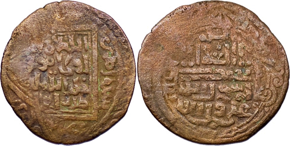 ILKHAN: Uljaytu, 1304-1316, AE ‘adliya (3.93g/ 28mm), Shiraz, AH71x, A-2190N, bottom line on obverse is ‘adliya shiraz, Shi’ite reverse as on type B in gold & silver, F, R.