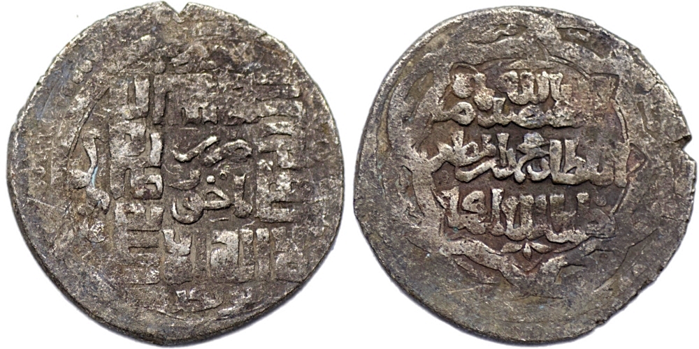 MUZAFFARID: Muhammad, 1335-1358, AR dinar (2.57g, 22mm), Makhur mint, A-2279U, type UA (plain circle), Dated 759?, Very RARE mint, F